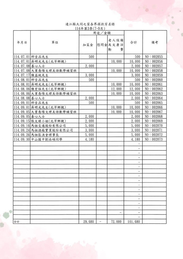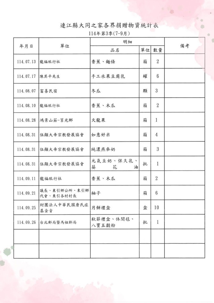 感謝114年第3季(7~9月)捐贈本家物資及善款之團體及人士們