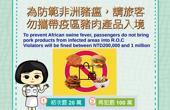 海關籲請小三通切勿攜帶豬肉製品回國 --閱讀人次 : 339 海關籲請小三通旅客切勿攜帶豬肉製品回國