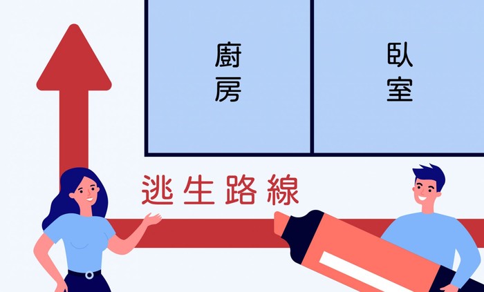 1.熟悉逃生避難路線,並且和家人每6個月至少做1次逃生避難演練(建議每次輪流選擇日間及夜間時段進行演練),確認逃生計畫內容是具體可行的。