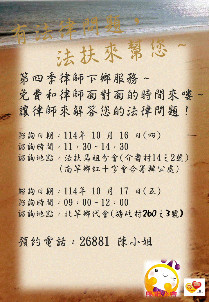 請各位鄉親好~又到了面對面免費法律諮詢服務~法扶會安排了10月16及17日,分別於南北竿提供專業且免費法律諮詢服務,有需求的鄉親,請多加把握機會。預約專線:0836-26881~