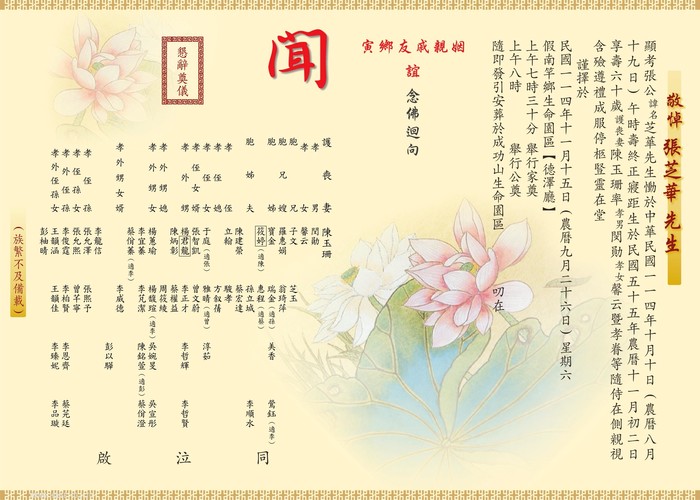 顯考張公諱名芝華先生慟於中華民國一一四年十月十日壽終正寢,享壽六十歲
