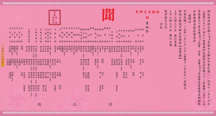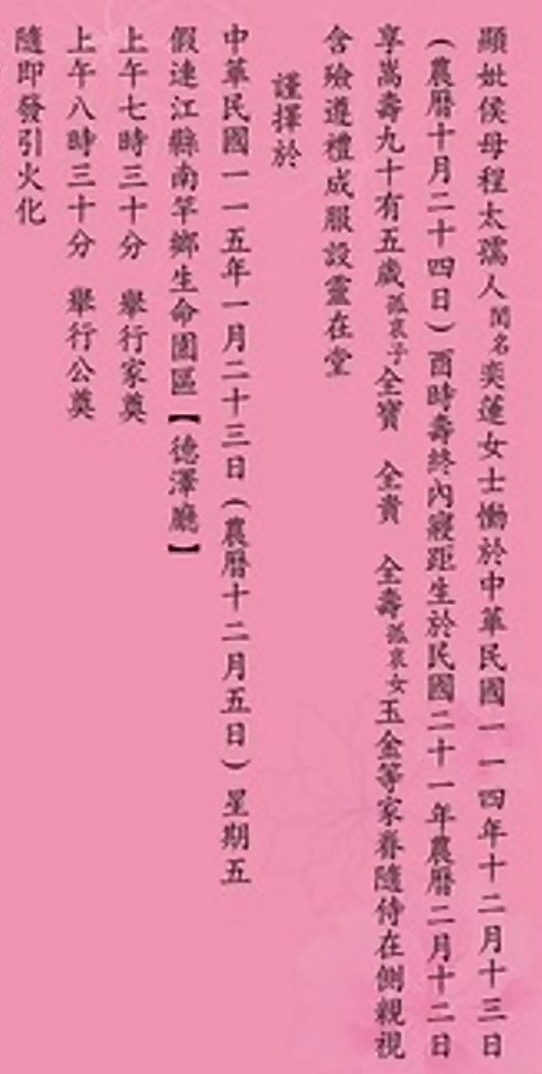四維村侯府程奕蓮老夫人訃聞