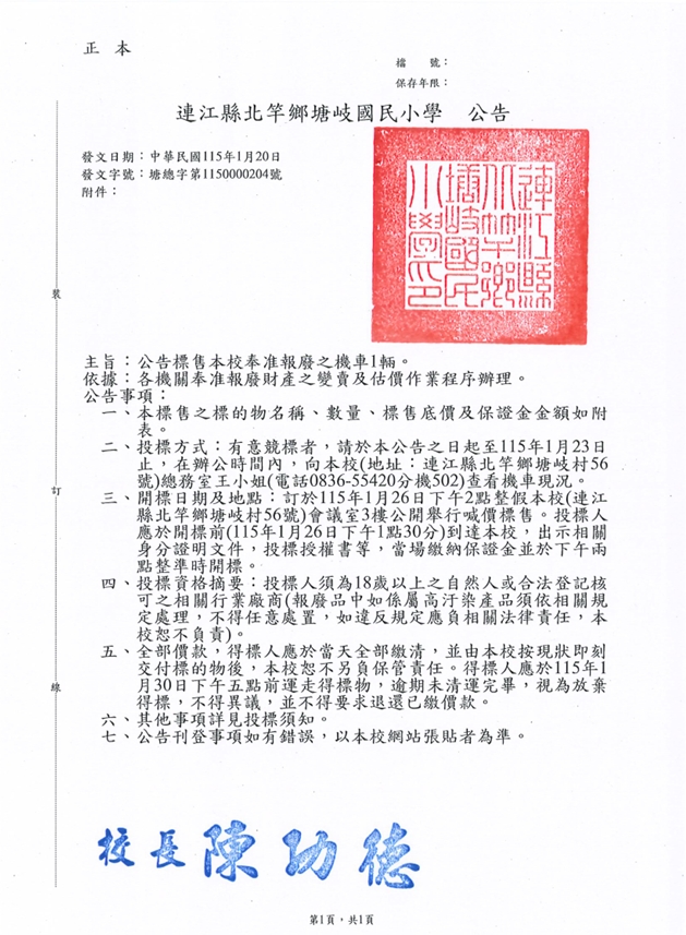 塘岐國小報廢公務機車標售公告