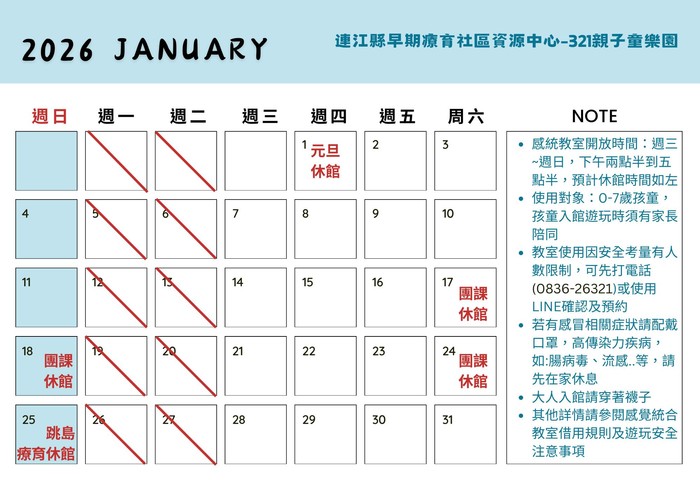 我們是位於樂活中心內的連江縣早期療育社區資源中心(321親子童樂園),自115年2月開始,早資中心會固定時間開放社區親子一同使用感覺統合教室啦,另外也會將行事曆在月底在馬資網公告休館日期,請各位親朋好友仔細看我們的開放時間以及感覺統合教室借用規則唷。