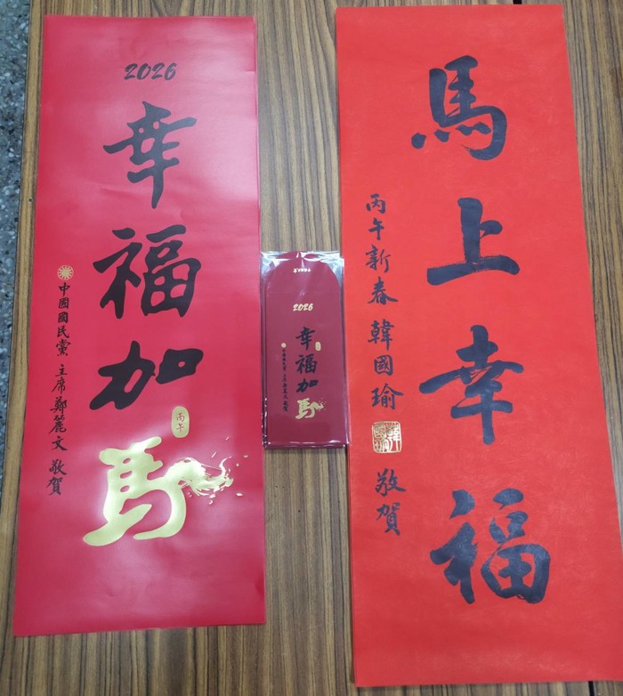 鄭麗文「幸福加馬」春聯、紅包袋及韓國瑜「馬上幸福」2026馬年新春祝賀春聯,已經運抵馬祖,中國國民黨連江縣黨部歡迎黨員暨鄉親就近索取(數量有限,送完為止),並祝賀大家幸福加馬、馬上幸福、新年快樂!