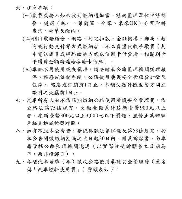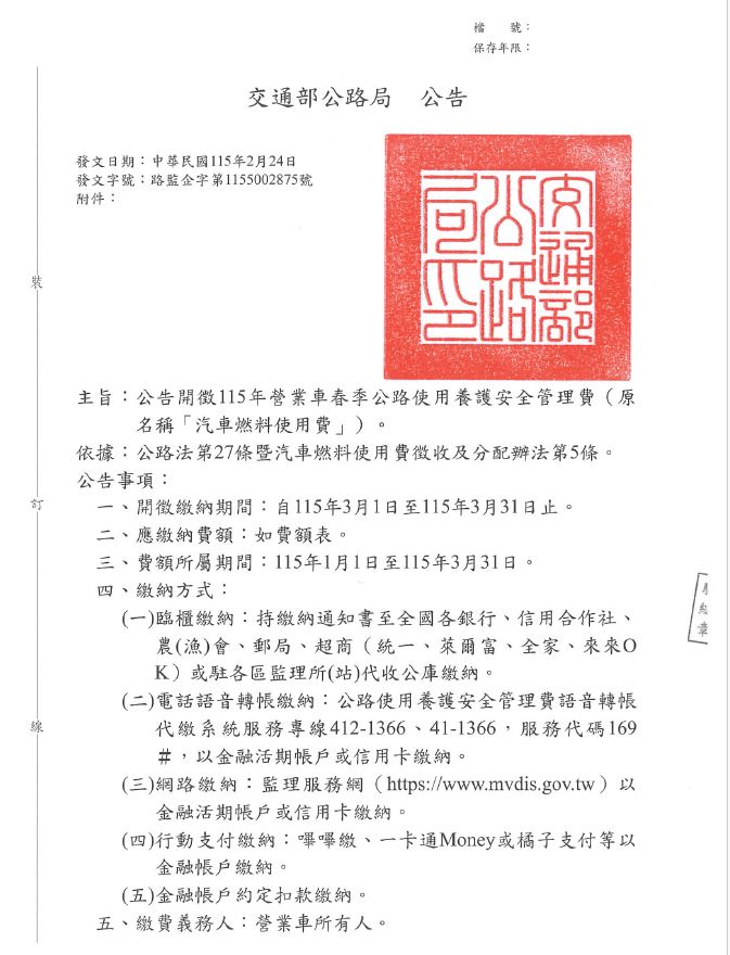 交通部公路局115年營業車春季公路使用養護安全管理費(原汽車燃料使用費)開徵公告