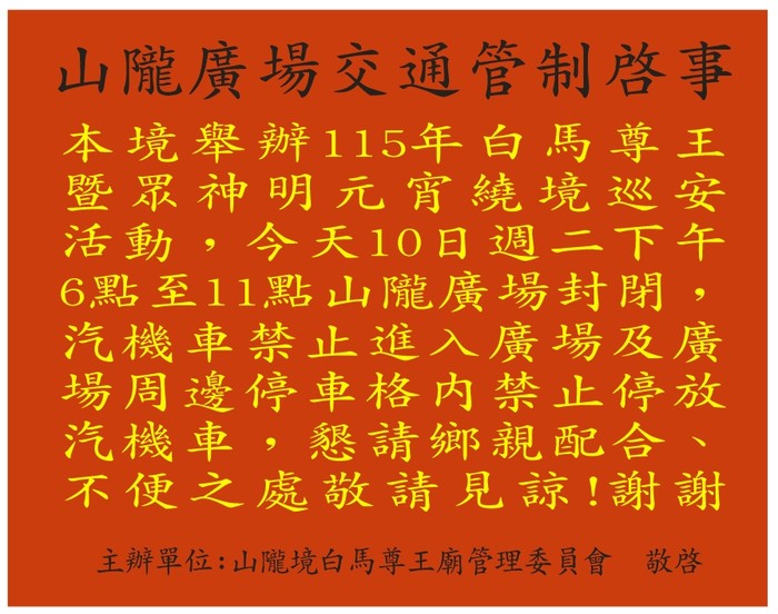 今日山隴廣場及巷道交通管制公告