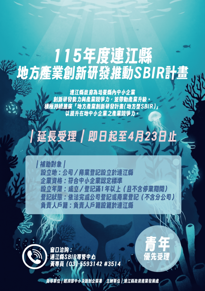 115年地方型SBIR計畫-延長收件 --閱讀人次 : 258 本年度徵件期延長,歡迎踴躍投件。