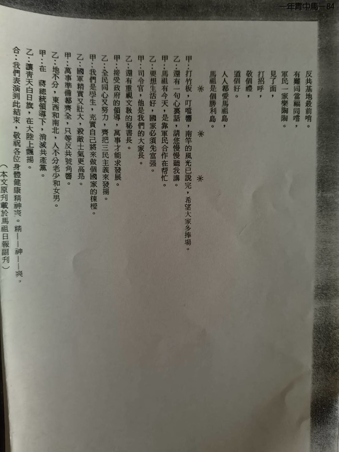 甲:馬祖有今天,是靠軍民合作在幫忙。