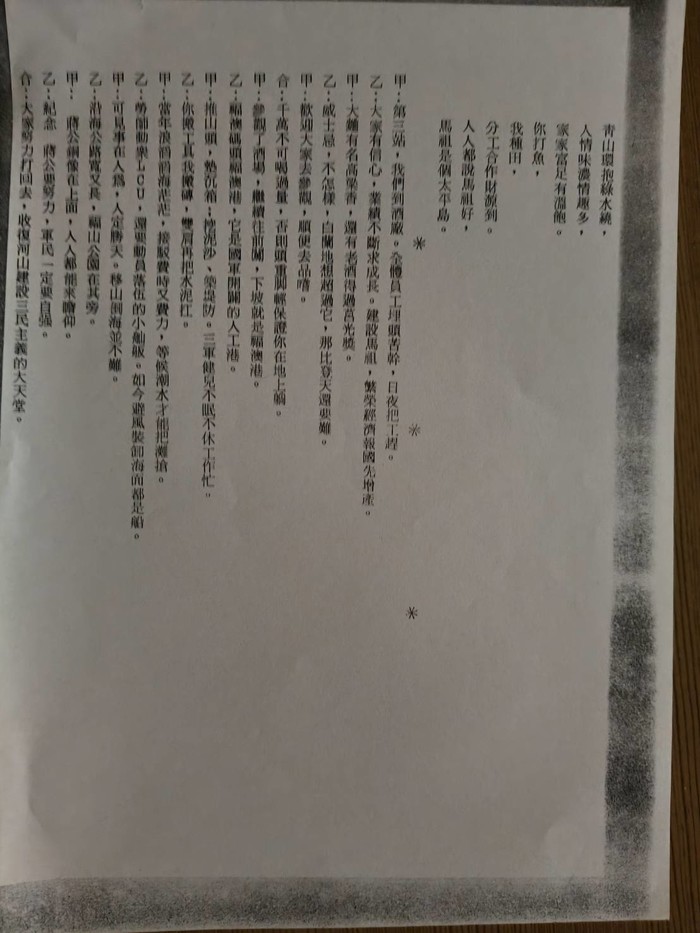 陳高志老師的離世令人猝不及防,馬祖失去這位對在地的文史和母語推動的長者,保存和整理高志老師遺世資料的任務更顯重要。這份創作的文件來自我與王建華校長的討論,應該是其與高志老師的好友蒐集而得的珍貴文件。獲得建華校長的允許,在此陸續的彙整謄錄高志老師的相關珍貴創作資料,以饗鄉親、使馬祖珍貴的文化得以傳承,若有鄉親願意分享高志老師的相關資訊,也請不吝告知。謝謝。