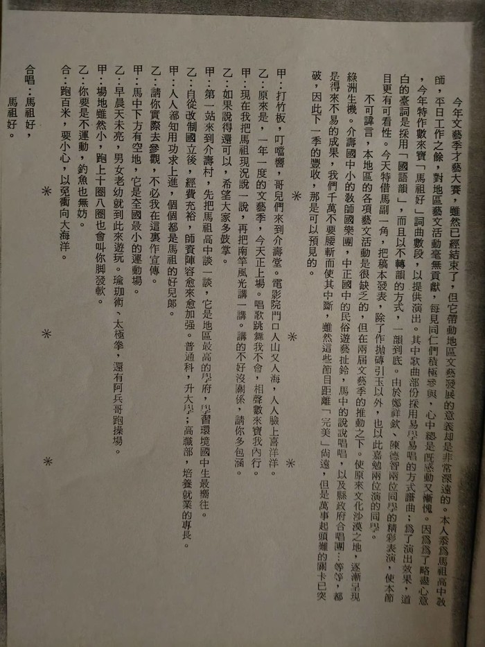 今年文藝季才藝大賽,雖然已經結束了,但它帶動地區文藝發展的意義卻是非常深遠的。本人忝為馬祖高中教師,平日工作之餘,對地區藝文活動毫無貢獻,每見同仁們積極參與,心中總是既感動又慚愧。為了略盡心意,今年特作數來寶「馬祖好」詞曲數段,以提供演出。其中歌曲部分採用易學易唱的方式譜曲;為了演出效果,道白的台詞是採用「國語韻」,而且以不轉韻的方式,一韻到底。由於鄭祥欽、陳德智兩位同學的精彩表演,使本節目更有可看性。今天特借馬副一角,把稿本發表,除了作拋磚引玉以外,也以此嘉勉兩位演的同學。