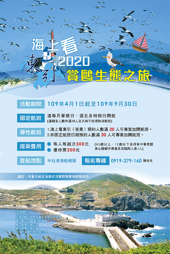 今年海上看東引-賞鷗生態之旅觀光活動固定航班逢每月單號日、星期五及例假日開航,但報名人數未滿10人及天候不佳得取消航班;非固定的彈性航班,今年增加夜間時段,只要預約人數滿20人即能加開航班。搭乘費用每人每趟次300元,優待票200元(65歲以上、12歲以下、持有身心障礙手冊者及其陪同者1人)。隨船皆有搭配解說員,報名專線:0919279160陳先生。