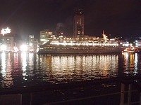 麗星郵輪的燈火 映在海面上 這天的台馬輪客滿