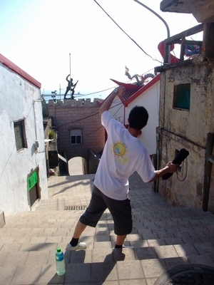 我們沒有「穿過大街、越過小巷」…我們只有「穿過小弄、越過後院」的走…來到了『忠誠門』,看看這傢伙,他很自動自發的做了相同的動作…所以我也很自動自發的拍了下來…