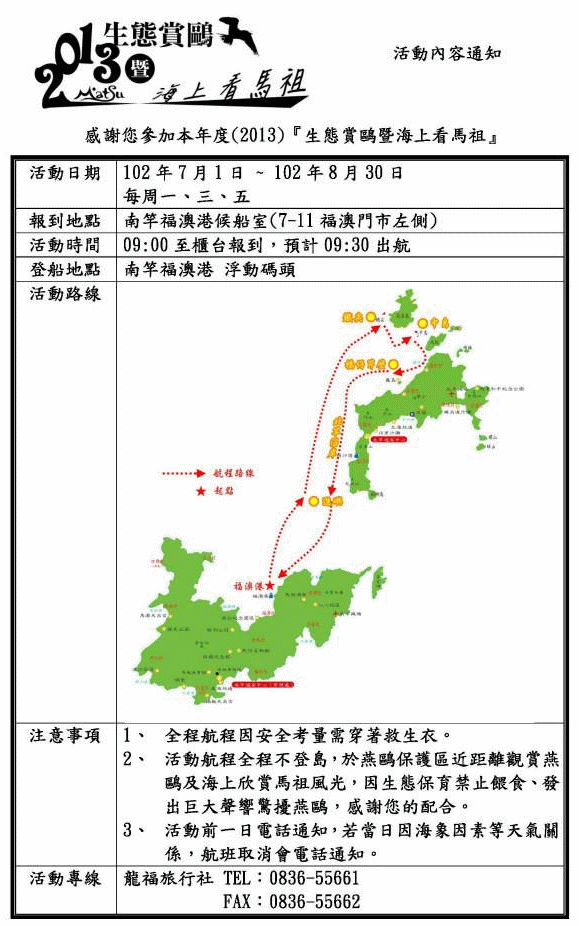 今夏「生態賞鷗暨海上看馬祖」(7/1~8/30)活動一覽表