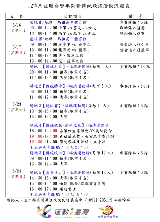 第十二屆馬祖聯合豐年祭8月16日展開,流程表及攤位配置全覽