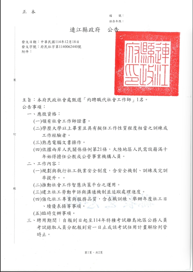 本府民政社會處甄選「約聘職代社會工作師」1名。