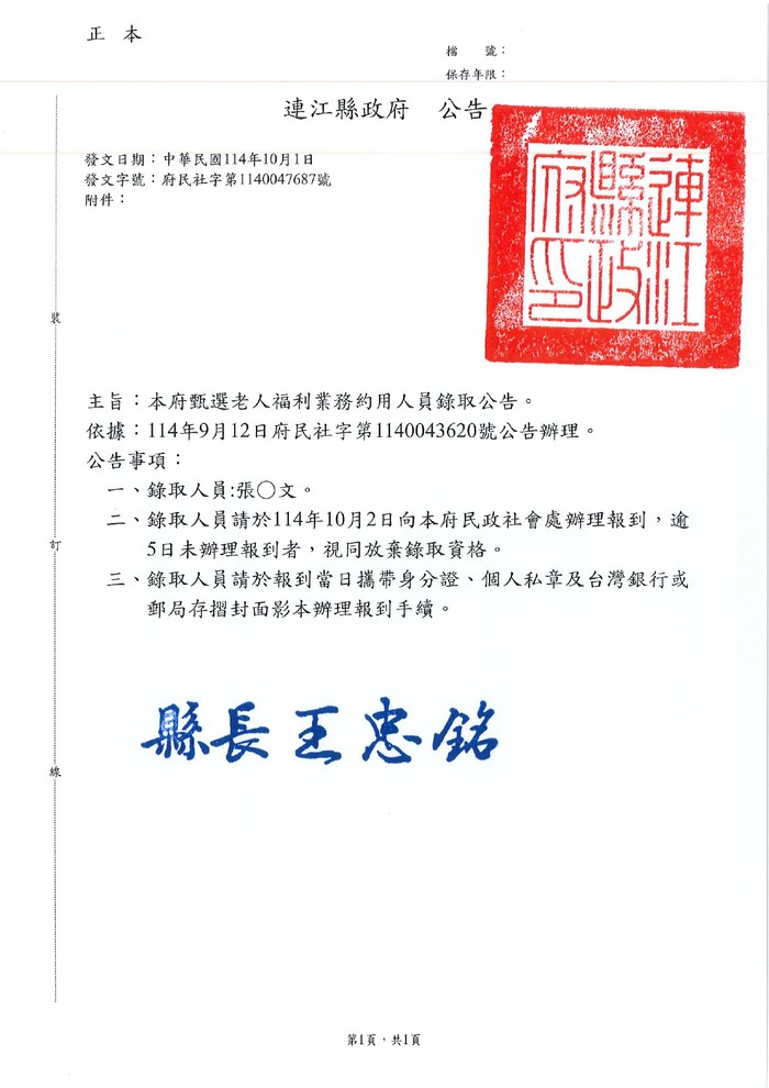 二、錄取人員請於114年10月2日向本府民政社會處辦理報到,逾5日未辦理報到者,視同錄取放棄資格。