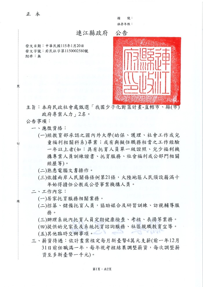 誠徵-民政社會處我國少子女化對策計畫專案人力2名 --閱讀人次 : 442 主旨:本府民政社會處甄選「我國少子化對策計畫-直轄市、縣(市)政府專案人力」2名。