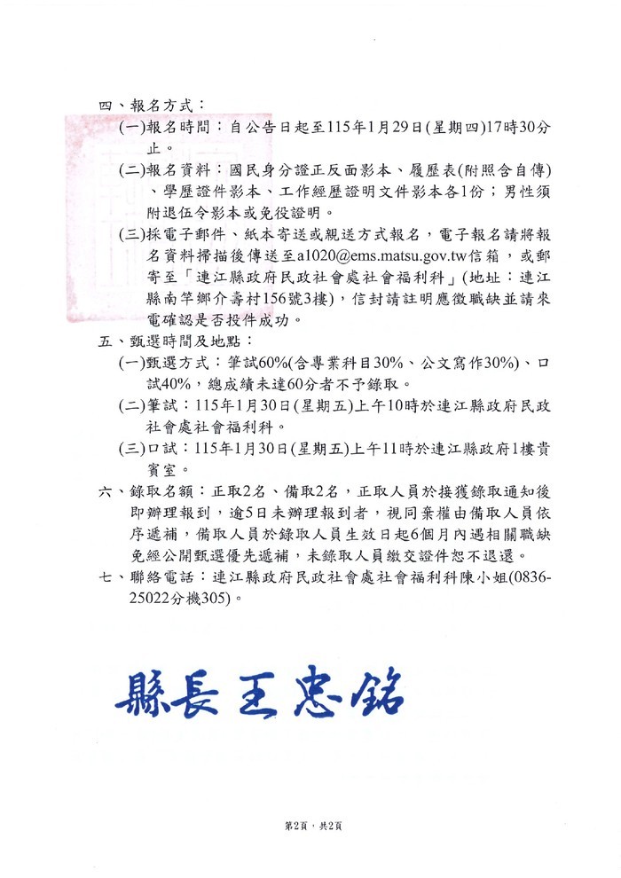 (二)筆試:115年1月30日(星期五)上午10時於連江縣政府民政社會處社會福利科。
