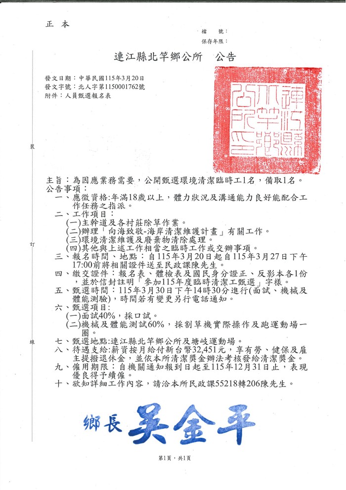 北竿鄉公所甄選環境清潔臨時工1名