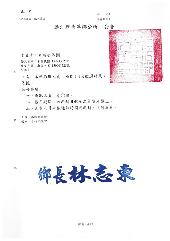 南竿鄉公所約用人員徵選結果公告