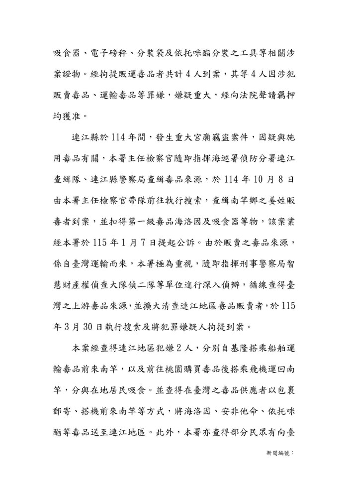 620 - 115/04/01連江地檢偵辦販賣、運輸毒品案件新聞稿 連江地檢偵辦販賣、運輸毒品案件,查獲被告4名,經向法院聲請羈押均獲准