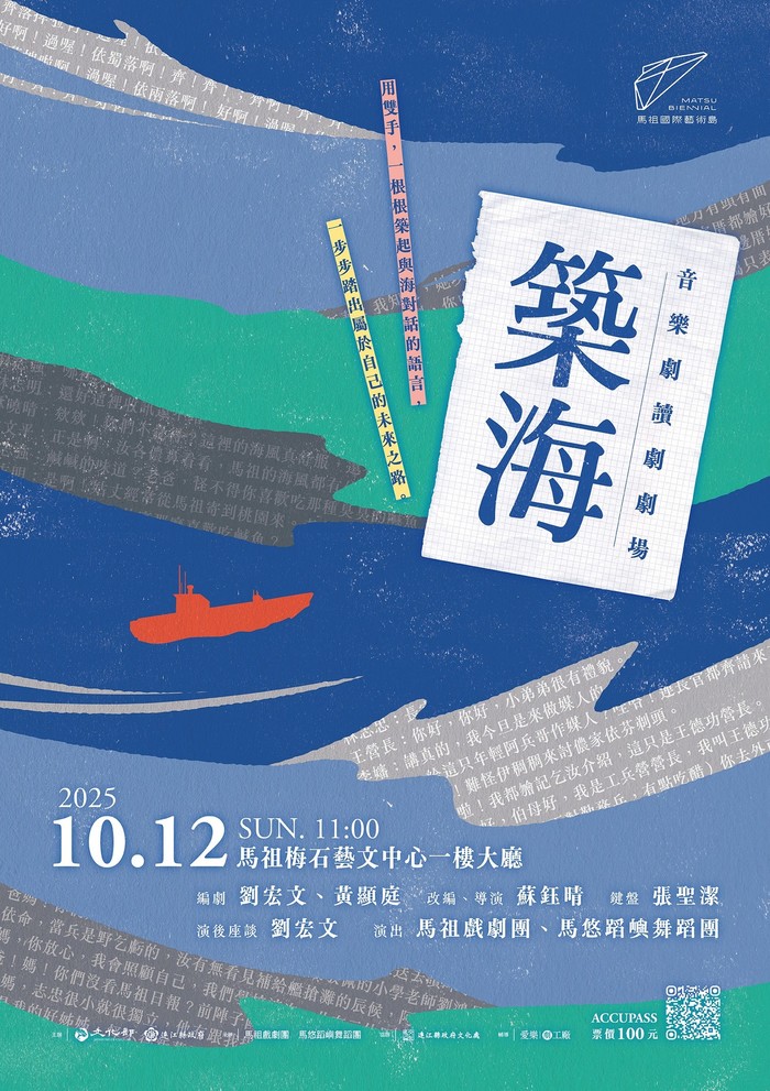 《築海》音樂劇讀劇劇場 馬祖,不只是海上的島嶼,更是世代安身立命的所在。漁民逐浪而生,拍楸、佈網,那是與海搏鬥、也與祖靈共存的日常。老一輩守著信念:「一只網目,養活一個人」;年輕人則渴望飛越天際,在傳統與變遷之間尋找自己未竟的夢。 在這...