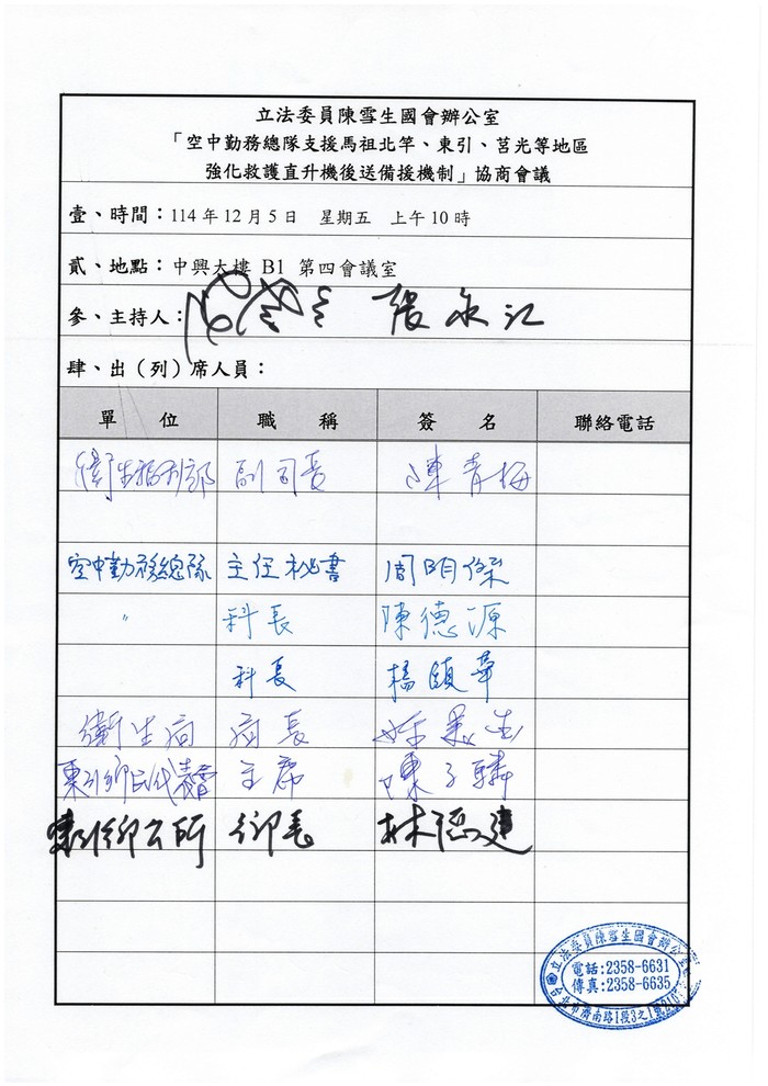 立委陳雪生召開協調會 強化夜間後送提升馬祖各島醫療安全 --閱讀人次 : 537 立法委員陳雪生、議長張永江於今(5)日上午共同主持「空中勤務總隊支援馬祖北竿、東引、莒光地區,強化救護直升機後送備援機制」協商會議,邀集內政部空勤總隊、交通部民用航空局、衛生福利部、空中轉診審核中心、連江縣衛生局長陳美金,以及各鄉與會人員:東引鄉長林德建、東引鄉民代表會主席陳子驎、北竿鄉公所課長王巧婷、北竿鄉民代表王冠予,研議離島夜間後送精進作為,獲致以下結論: