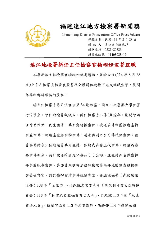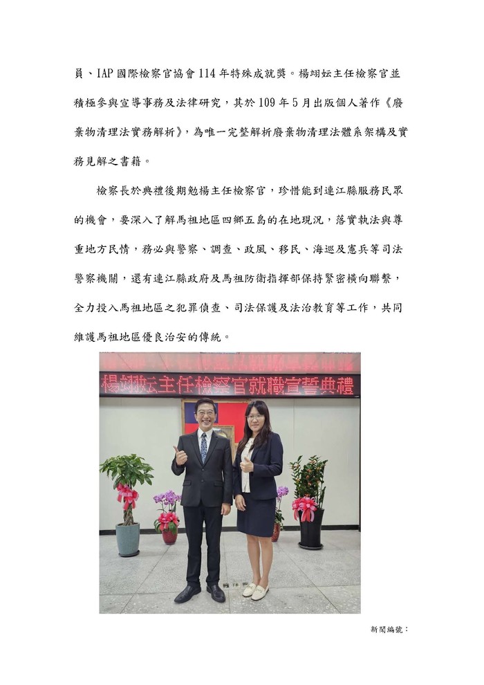 8/28連江地檢署新聞稿:主任檢察官楊翊妘就職典禮