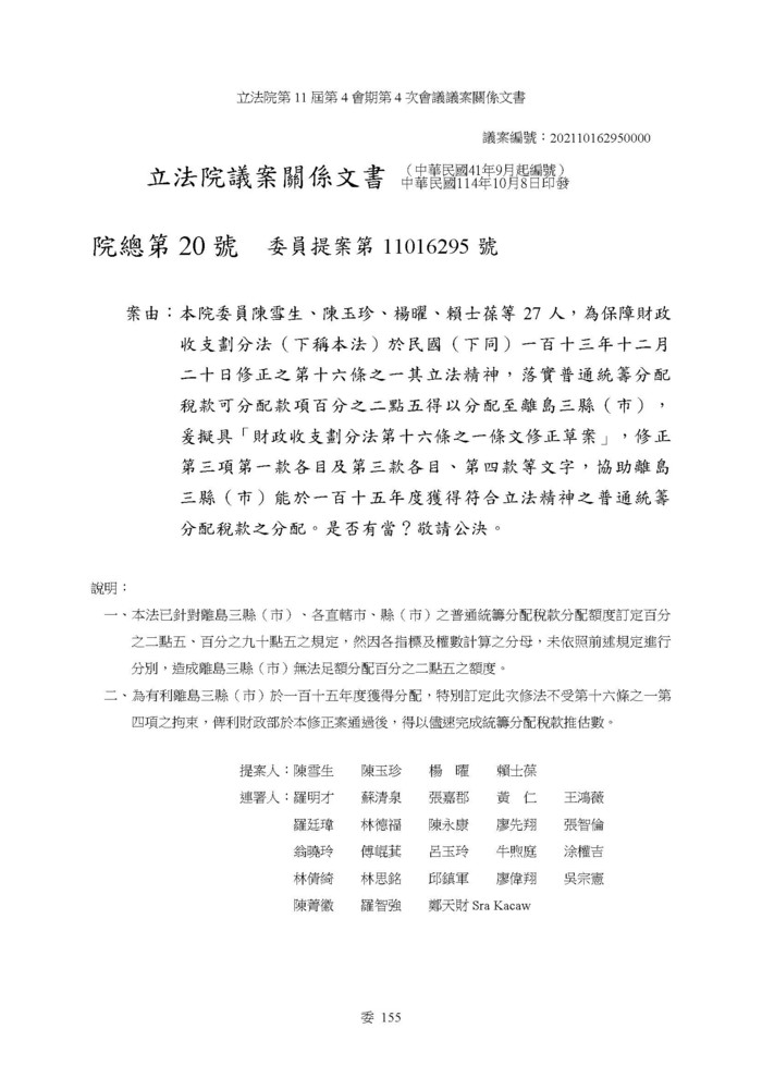陳雪生等27位立法委員所擬具的《財政收支劃分法》第十六條之一條文修正草案,經由中國國民黨立法院黨團召集協商,已於10月14日逕付二讀。
