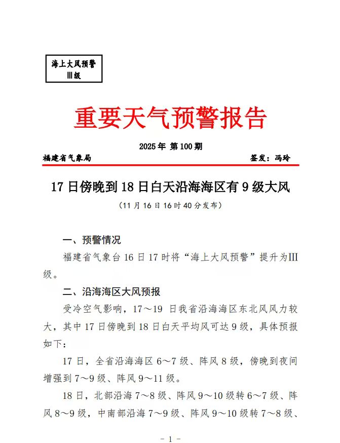 【福州市气象局】两马航线:今天15-16时,平均风:4.7米/秒(3级);极大风:8.1米/秒(5级)。17日,东北风7~8级,阵风9~10级;天气阴转小雨,气温17~22℃;能见度17.0~20.0千米。18日,东北风7~8级,阵风9~10级;天气阴转多云,气温13~19℃;能见度24.0~27.0千米。19日,东北风7~8级,阵风9级;天气多云,气温9~15℃;能见度26.0~27.0千米。11月16日16时发布。