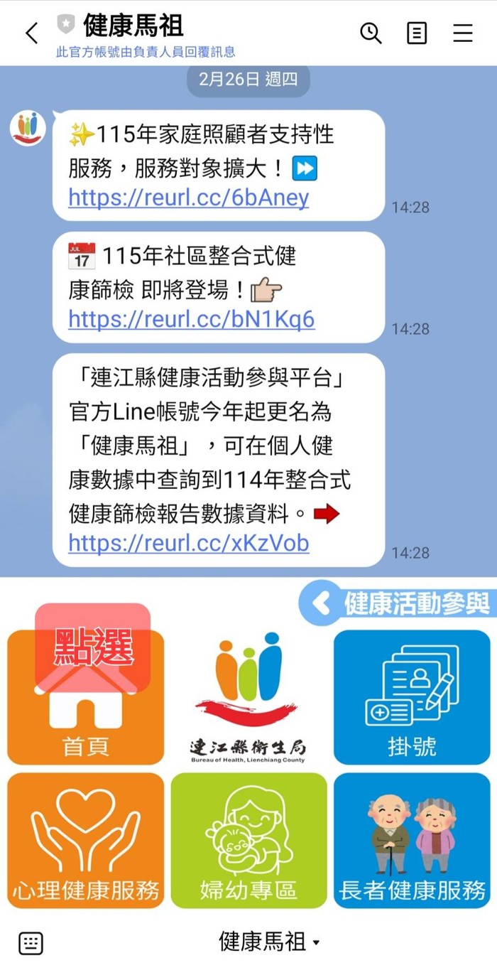 整合式健檢預約報名開始囉! --閱讀人次 : 1298 今年預約報名將運用LINE「健康馬祖」平台,註冊完成後依預約報名流程(請參考下方截圖)進行預約報名。