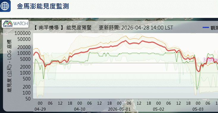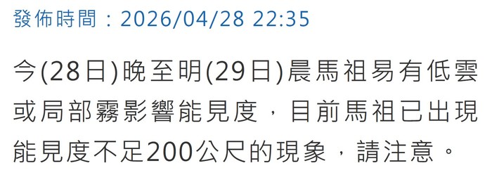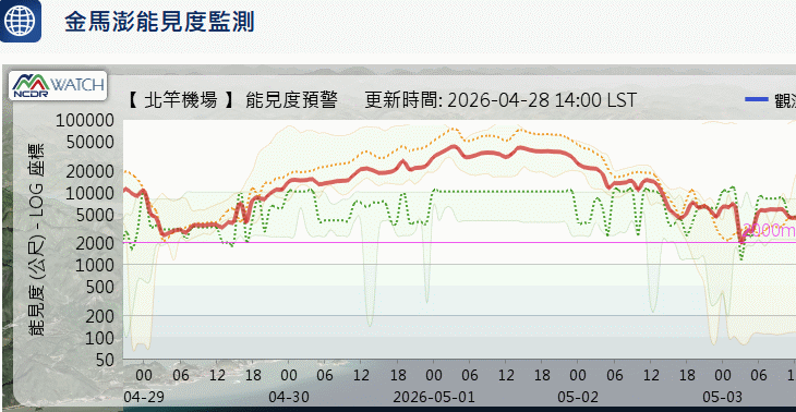 昨天晚上中央氣象署發布馬祖地區濃霧特報,但清晨3左右馬祖能見度尚佳,預報與天氣實際狀况有落差。另外,天氣與氣候監測網預報,今天馬祖能見度欠佳,明天起連續3天能見度均佳。