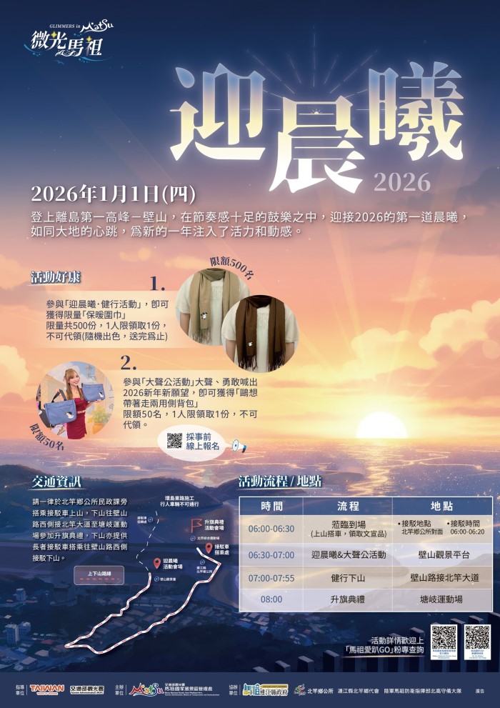 由交通部觀光署馬祖國家風景區管理處(馬管處)結合北竿鄉公所、北竿鄉代表會、北高守備大隊等單位共同辦理,邀請民眾2026年1月1日前往離島第一高峰-馬祖北竿壁山迎晨曦,大聲喊出自己的新年願望與目標,再健行至塘岐運動場進行升旗典禮,讓新的一年挹注元氣與活力!現場除了準備文宣品要送給大家,還有行進鼓人Drumacue表演及大聲公迎晨曦活動,大聲公活動將於12月8日(一)中午12點起開放報名,名額有限,歡迎大家踴躍參加。