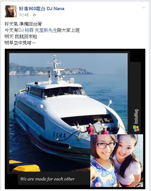 主持音樂會 好事903電台DJ Nana 臉書貼莒光3日遊 --閱讀人次 : 3469