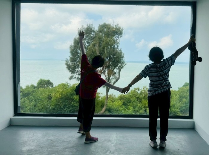 近30位長者們上午從仁愛村出發,首站抵達「77據點—等待美術館」,欣賞在社群上引起話題的網紅窗景;再前往由馬祖藝術家陳益輝製作的大型作品「築巢」,在象徵馬祖人處境的巢形鋼構前,留下大合照。