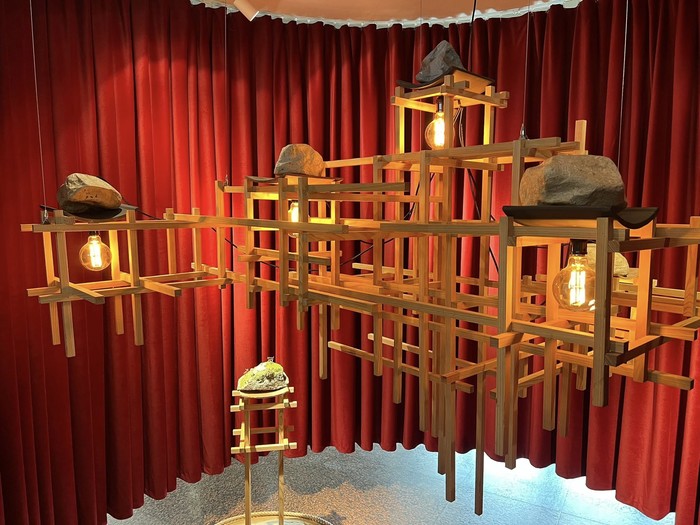 作品融合馬祖建築特色,以「壓瓦石」象徵面對強風的生活智慧,並以方正木構架呼應聞式家屋的秩序與庇護感。結構交錯連結,如同島上世代居民間緊密的情感網絡。布幔圍繞空間,象徵家的保護層,也呼應燈火管制時期對光的遮蔽。微...