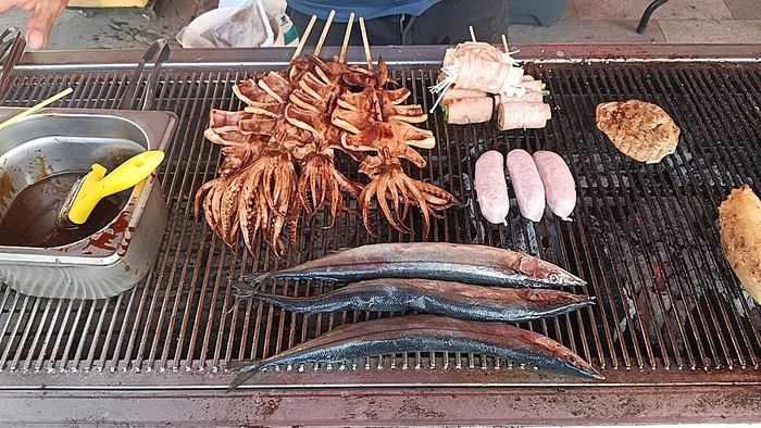 烤魷魚180元/吐司夾肉60元/秋刀魚80元/香腸3條1百/蔥卷一串50