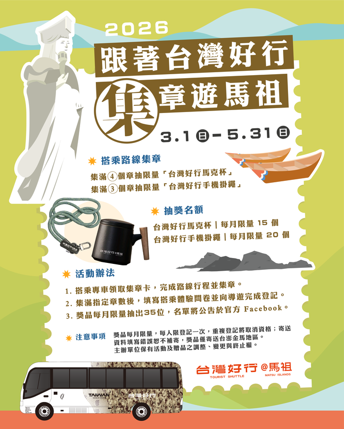 為鼓勵民眾多加利用台灣好行大眾運輸服務,並以更輕鬆的方式深入探索馬祖各島特色景點,「台灣好行@馬祖」推出「跟著台灣好行,集章遊馬祖」活動,自115年3月1日起至5月31日止,邀請旅客搭乘指定路線、完成集章任務,在旅途中留下專屬紀錄,同時有機會參與每月抽獎,將限量紀念品帶回家,讓旅程增添更多回憶。