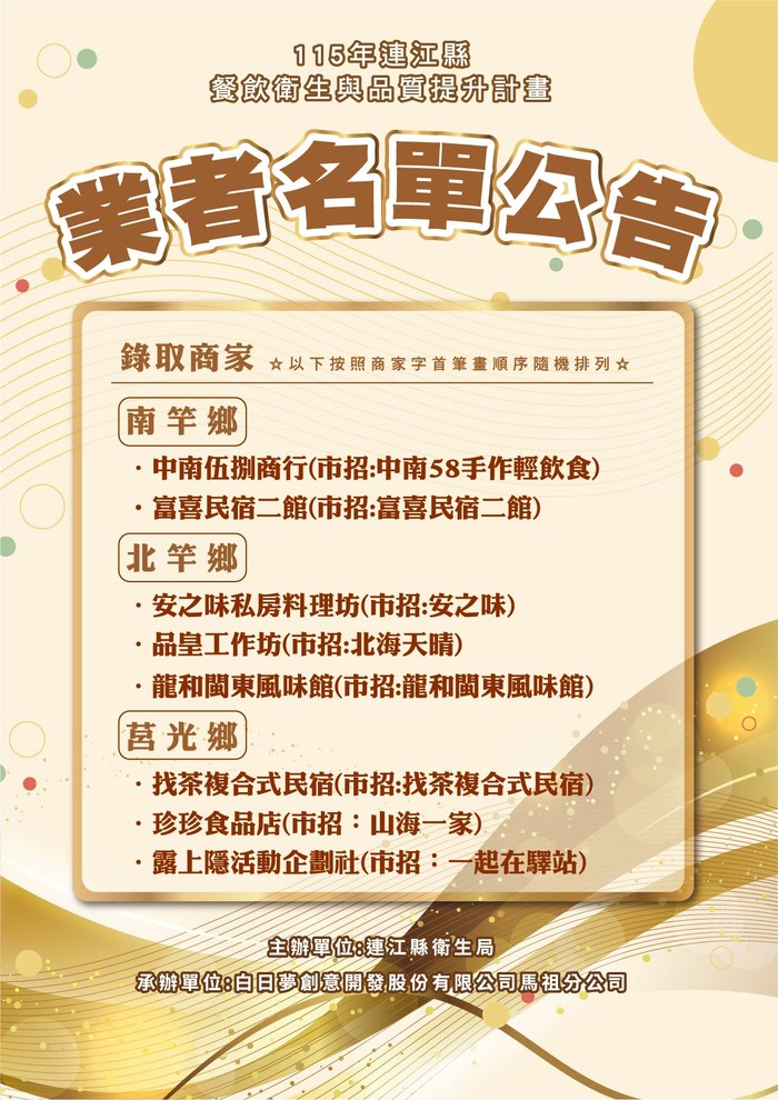 今年的輔導計畫一經推出,便吸引馬祖四鄉五島業者踴躍報名,大家都希望能透過專家的手,讓自家的衛生管理與品牌力更上一層樓。由於業者參與意願極高、表現難分軒輊,評審委員在審慎考量後,決定由原定的 7 個名額驚喜「加碼」至 8 名,讓更多優質潛力股加入這場進化旅程!