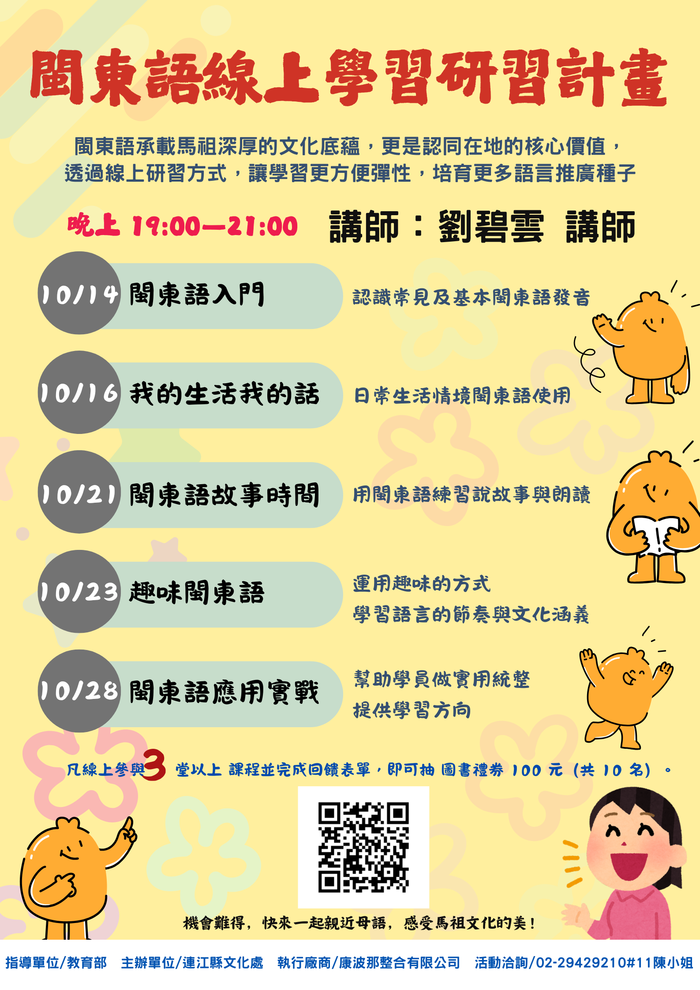 為了讓這份珍貴的語言重新走進生活,連江縣政府文化處推出 👉 「閩東語線上學習研習計畫」,讓大家不出門、不請假,也能在家輕鬆學母語!