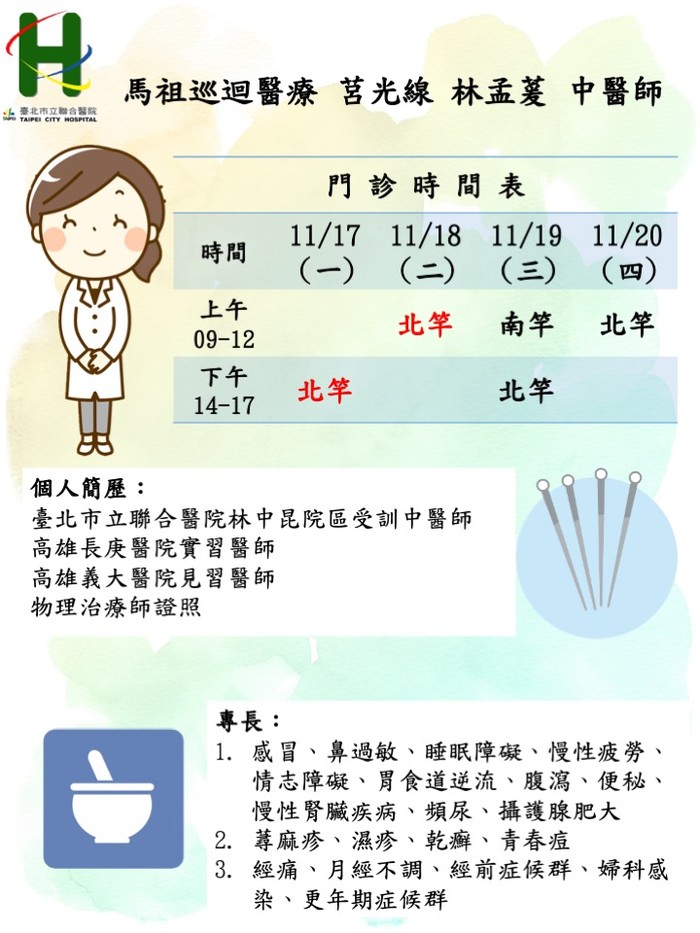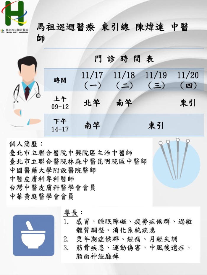 馬祖中醫巡迴醫療114/11/17-11/20由莒光線林孟萲醫師、東引線陳煒達醫師前往支援服務。