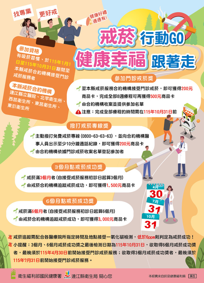 為鼓勵民眾善用專業戒菸資源,本縣推出戒菸獎勵活動,