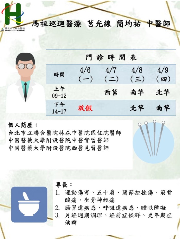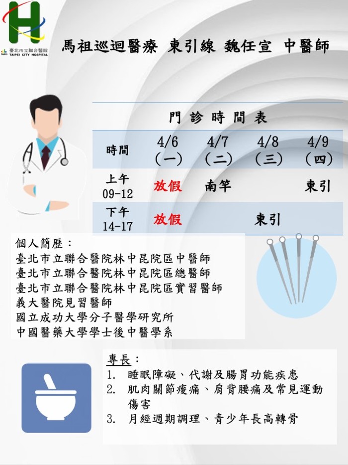 馬祖中醫巡迴醫療4/6–4/9由莒光線簡均祐醫師、東引線魏任宣醫師前往支援服務。