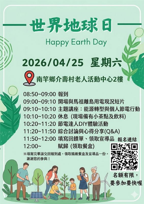 地球日環教體驗活動,開始報名囉! --閱讀人次 : 750 為響應每年的「世界地球日」,環境資源局舉辦以「低碳生活・節能實踐家」為主題的環境教育體驗活動,活動將於4月25日(星期六)上午9點在介壽老人活動中心登場,邀請民眾透過觀賞影片、節能知識學習及蜂蠟布保鮮膜等實作體驗,深入認識馬祖用電現況,不僅節能減碳還能省荷包。