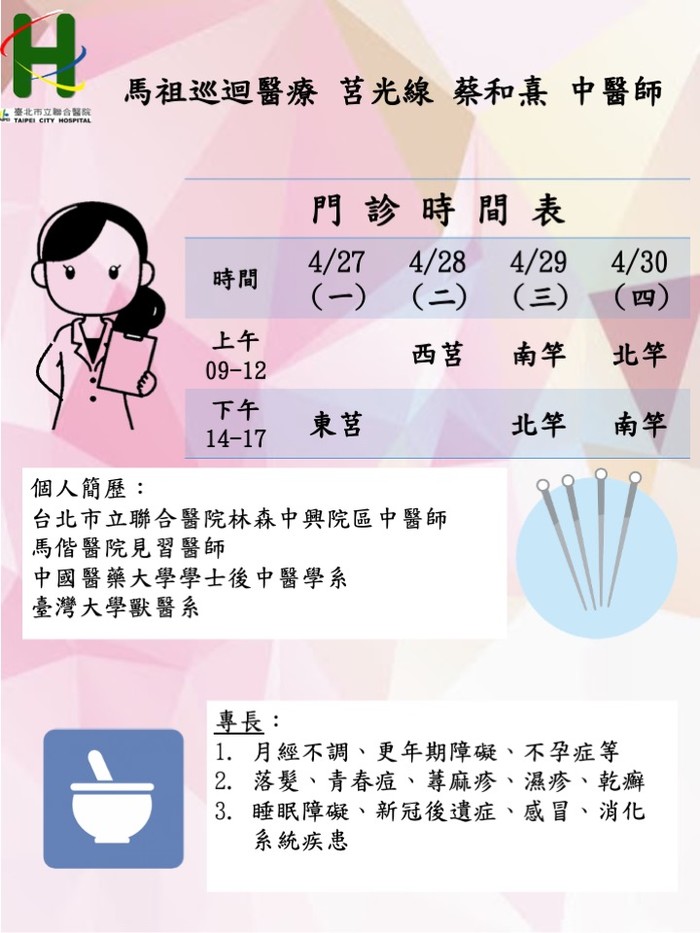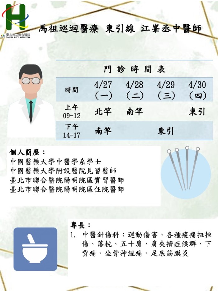 馬祖中醫巡迴醫療4/27–4/30由莒光線蔡和熹醫師、東引線江峯丞醫師前往支援服務。
