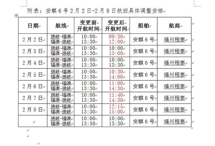 琅岐航線(安麒6號)1/19-2/15航班異動