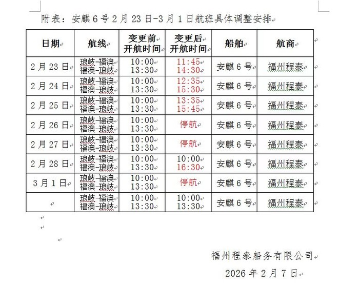 琅岐航線(安麒6號)2/16-3/8航班異動