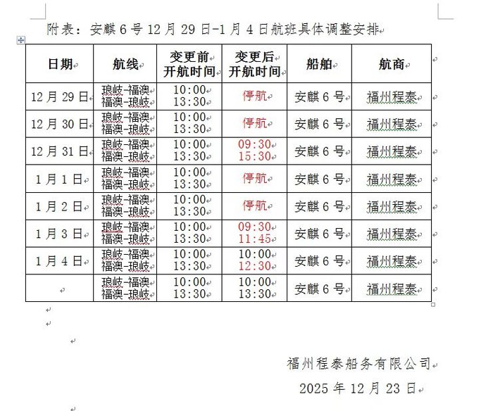 琅岐航線(安麒6號)12/22-1/4航班異動公告